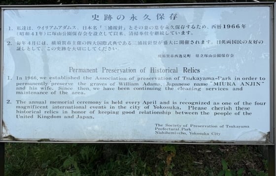 Tokugawa Ieyasu rewarded William Adams’ loyalty with the status of hatamoto, a high-ranking Samurai in the direct service of Tokugawa shoguns. This status also came with a fief, which for Adams was at Hemi in Yokosuka on the Miura Peninsula just south of Tokyo. A grave to Adams’ Japanese wife, Oyuki, and children is found here in a quiet park on a hill but otherwise there is little to remind us of his connections except in the name of two railways stations, Hemi and Anjinzuka, on the Keikyu Railway, which connects the peninsula to Yokohama, Kawasaki and Tokyo. Anjinzuka is derived from Adams’ Japanese name Miura Anjin and tsuka (elided into zuka) which means mound or hill.